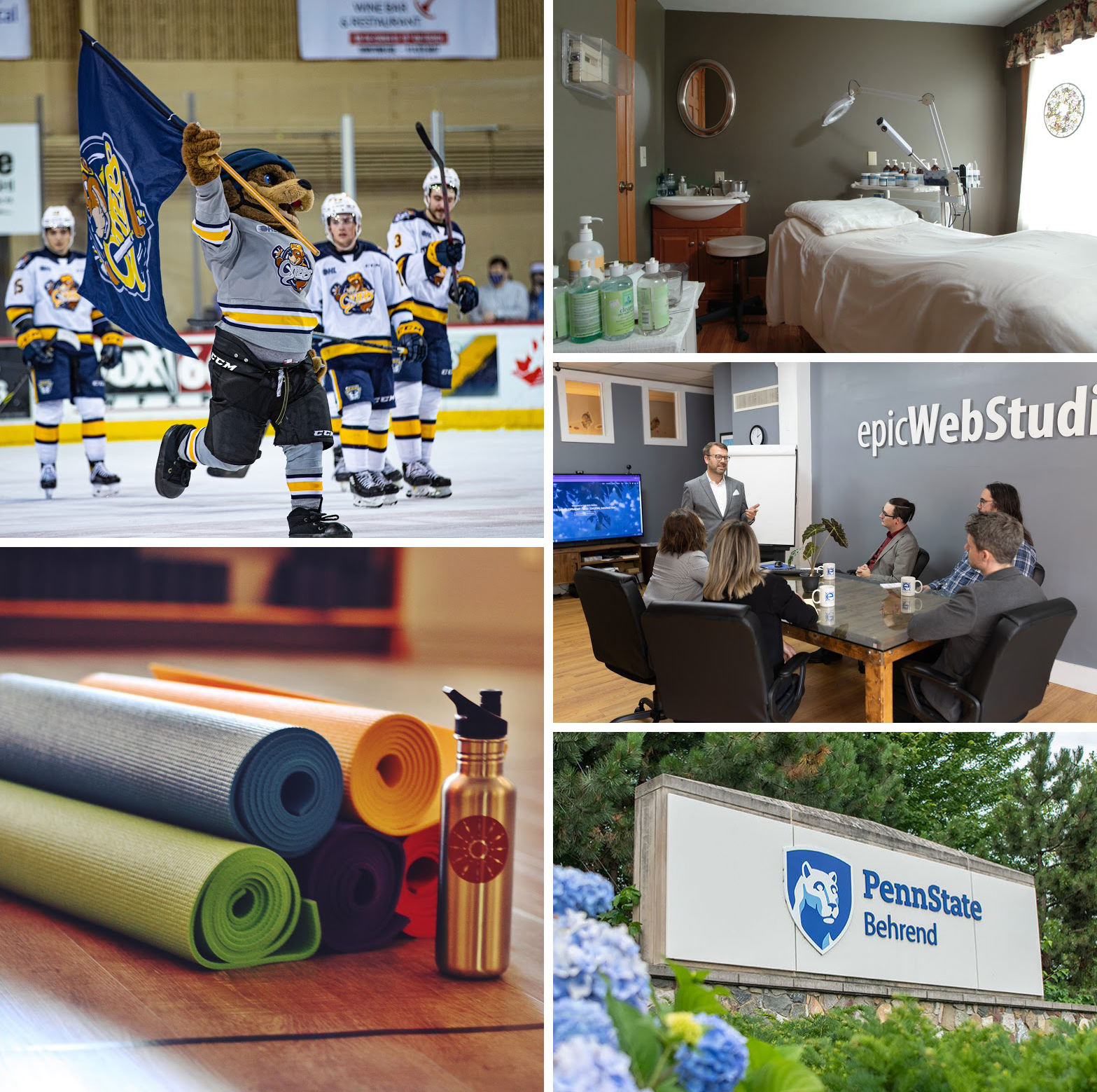 Winners of their Best of Erie categories since the inception of the awards in 2014 include (Clockwise from top left): The Erie Otters for Best Team to Root For, Coventina Day Spa for Best Spa, Epic Web Studios for Best Web Developer, Penn State Behrend for Best College or University, and YogaErie for Best Yoga Studio. (Photos: Jessica Hunter / Contributed)