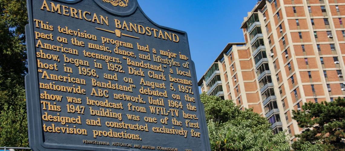 Between 45th and 46th streets in West Philadelphia, a Pennsylvania Historical and Museum Commission (PHMC) marker stands on Market Street. The fifth of five sentences informs passersby that the Nationally Registered Historic building erected there in 1947 was "one of the first designed and constructed exclusively for television productions." Noteworthy for its potential, sure, but the first four sentences explain how and why the building gained national notoriety: It was the birthplace of American Bandstand.